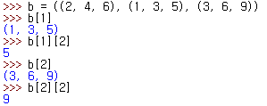 정의된 변수 b는 tuple내에 tuple이 정의된 경우입니다. b[1]을 보면 (1, 3, 5)라는 tuple이 정의되어 있고 b[1][2]는 5라는 결괏값을 보여줍니다.