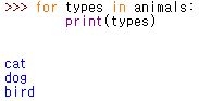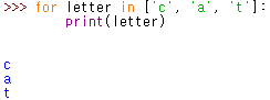 위 예제의 for loop는 ['c', 'a', 't']의 항목들을 letter라고 정의하고 letter의 값들을 차례대로 출력합니다.