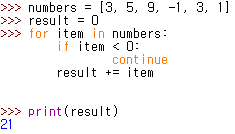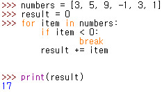 for loop가 명령어를 반복하기 전에 result라는 변수를 0이라고 정의합니다. 위의 예제와 동일하게 if 문을 사용하여 numbers의 아이템이 음수인지 확인하여 음수이면 for loop를 마무리합니다.