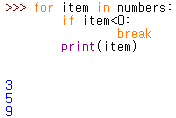Numbers의 아이템을 차례대로 확인하여 양수이면 (3, 5,9) 출력을 하고 음수가 되면 break로 인해 for loop를 빠져나옵니다. 이때 아이템의 양수 음수 확인은 if문을 사용합니다.