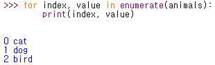 여기서 enumerate 함수는 순서대로 있는 아이템의 index와 item을 포함하고 있는 튜플(tuple)입니다.