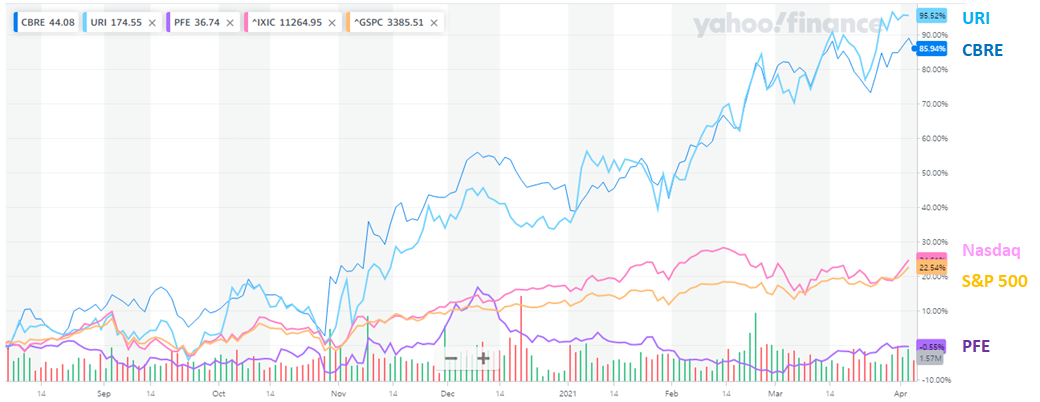 CBRE는 85.9%, URI는 95.5%, PFE는 -0.5%를 보여주고 있습니다. CBRE와 URI는 기본 지수인 Nasdaq과 S&P 500 지수의 수익률을 훨씬 넘는 성과를 보여주고 있습니다.