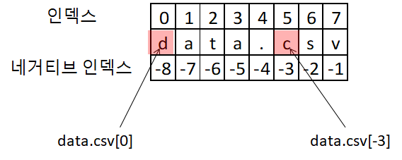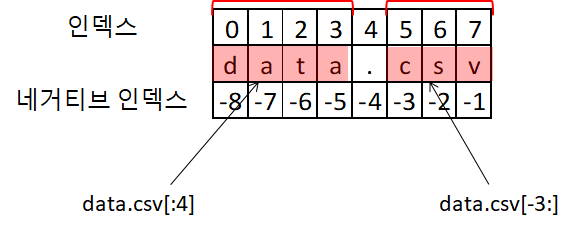 data.csv[-3:]는 네거티브 인덱스 -3부터 마지막 인덱스까지 1씩 증가하므로 결과는 csv입니다.
