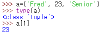 위의 tuple의 인덱스 0은 'Fred', 인덱스 1은 23, 인덱스 2는 'Senior'