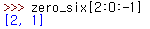 [2:0:-1]은 세 번째 인덱스부터 두 번째 인덱스까지 -1씩 감소합니다.