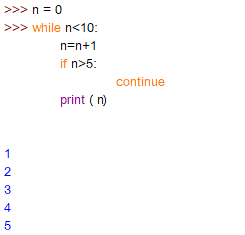 - if 문에서 n이 5보다 크면 continue명령어 때문에 while loop 조건문으로 돌아감