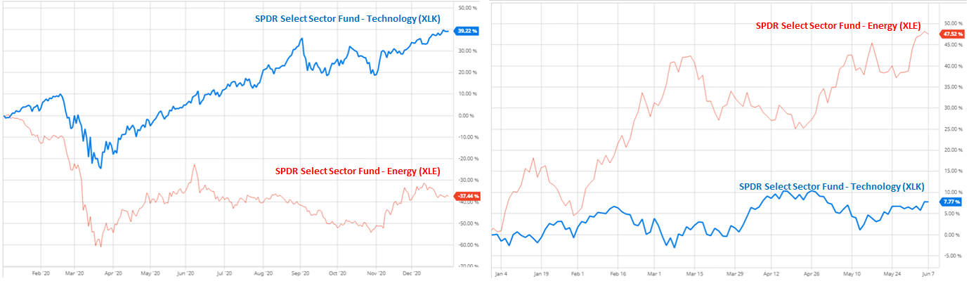 2020년/2021년 기술주와 에너지주의 수익률 비교