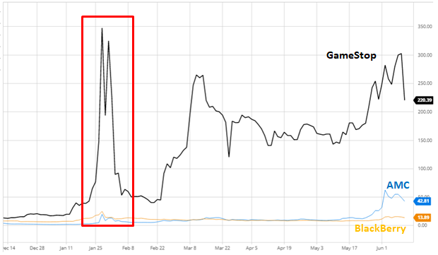 밈 주식의 예로는 GameStop, AMC 및 BlackBerry가 있습니다. 이 회사들은 최근 몇 년 동안 실적이 좋지 않았지만, Reddit 포럼에서 투자자들 사이에 입소문이 난 후 1월 말 엄청난 가격 상승을 보였습니다. BlackBerry의 주가는 3배 이상 상승, AMC는 거의 10배 상승, GameStop은 며칠 만에 수백 달러가 상승하였습니다.