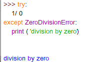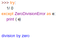 1/0 연산을 실행하면 except가 ZeroDivisionError 형태의 오류를 division by zero로 출력합니다.