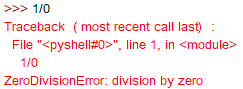 가장 대표적인 예가 숫자를 0으로 나누게 되면 ZeroDivisonError: division by zero라는 오류 메시지를 보여줍니다.
