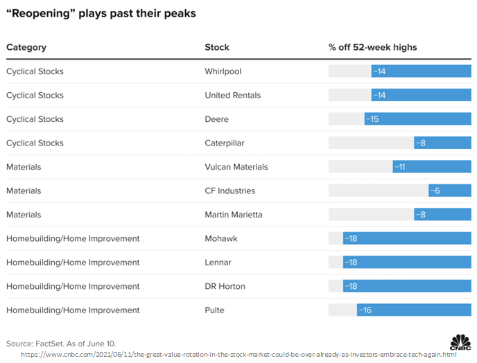 얼마 전부터 올해 초부터 시장을 이끌었던 섹터 순환(기술주 (성장주)에서 가치주로의 섹터순환)이 끝나고 있을지도 모른다는 기사들이 올라오기 시작했습니다. (섹터 순환에 대해서 궁금하신 분은 지난 포스팅 섹터 순환을 참고하시면 됩니다.)