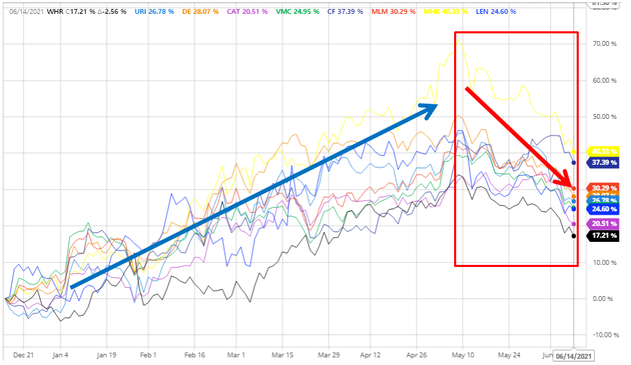 위에서 언급된 개별 주식들의 수익률 그래프를 살펴보면 작년 말부터 1분기를 지나면서 지속적으로 상승세를 이어오다가 5월 초를 기점으로 하락이 시작된 것을 볼 수 있습니다.