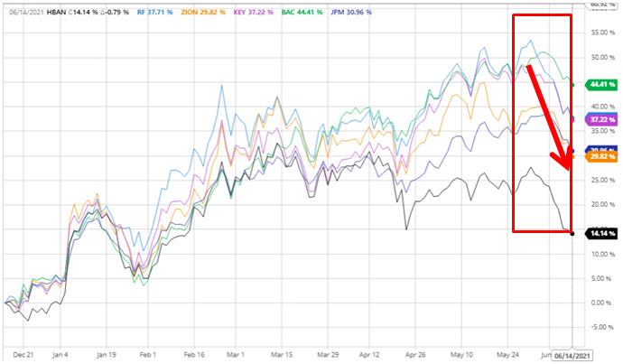위에 나온 개별 은행주 수익률을 보면 5월 중순 이후 하락하고 있는 것을 볼 수 있습니다.