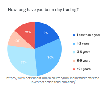 미국 투자자 1500명을 대상으로 팬데믹 이후 데이 트레이딩의 증가가 투자자의 행동에 미치는 영향에 대한 설문 조사 결과를 정리한 아티클을 참고하였습니다. (원문은 How Memestocks Affected Investors’ Actions And Emotions (Section One: The Rise Of Day Trading Activity))