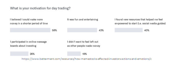데이 트레이딩을 하는 주된 이유는 짧은 시간에 더 많은 돈을 벌 수 있다고 믿고 있습니다. (58%).재미로 데이 트레이딩을 하는 투자자들은 43% (재미로 데이 트레이딩을 하는 투자자들의 절반 (52%)은 COVID-19로 인해 즐길 수 없는 취미 활동 (스포츠, 음악, 사교 모임, 도박 등)을 보충하기 위한 것이라고 대답했습니다.)