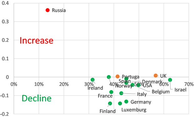 러시아를 제외한 다른 국가의 경우 사망률이 줄어든 것을 볼 수 있습니다. 여기서 사망률이 증가한 러시아의 경우 전체 인구의 14% 만 예방 접종을 한 경우입니다.