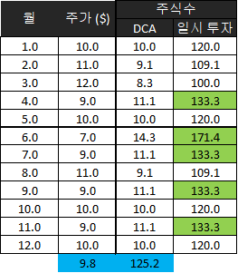 위의 표를 보면 DCA를 사용해 매달 100달러를 투자했을 때 1년 후 주식 수는 126.1이 되고, 평균 주가는 9.6달러가 됩니다.