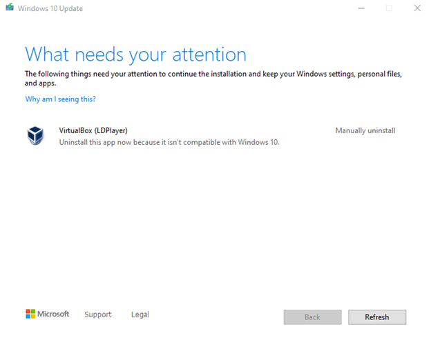 에러 메시지는 VirtualBox 관련 에러로 데스트탑에 설치되어 있는 VirtualBox가 윈도우 10과 호환되지 않아서 업데이트를 실행할 수 없다는 내용이었습니다.