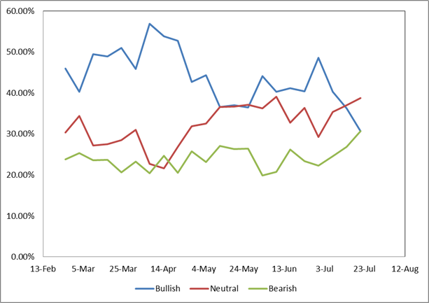 위 결과를 보면 개인 투자자들의 최근 시장에 대한 감정은 Bullish에서 조금씩 Bearish로 바뀌고 있는 것을 볼 수 있습니다. 이번 주에는 약세 심리가 24주 만에 처음으로 역사적 평균을 상회했습니다. 낙관적 감정은 다시 하락하여 10개월 최저치로 떨어졌습니다.