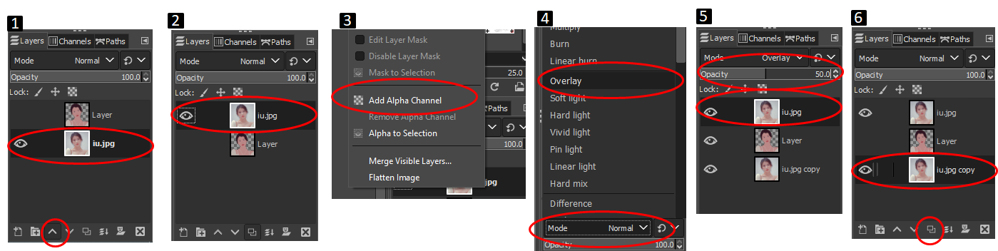 4. 레이어 윈도우 위쪽 모드 툴바를 클릭해서 Overlay를 선택합니다.