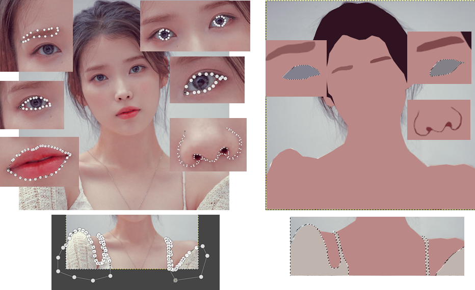 눈썹, 눈 외곽 라인, 눈동자, 입술, 코 외곽 라인, 옷 외곽 라인 등을 위에서 사용한 동일한 방법으로 선택하고 색상을 넣어줍니다.