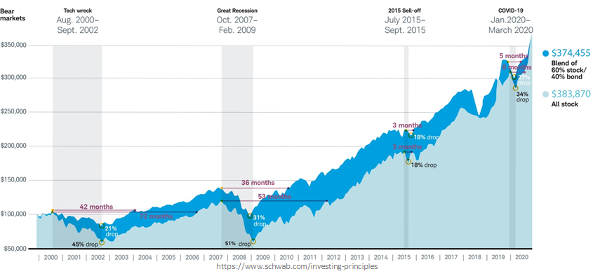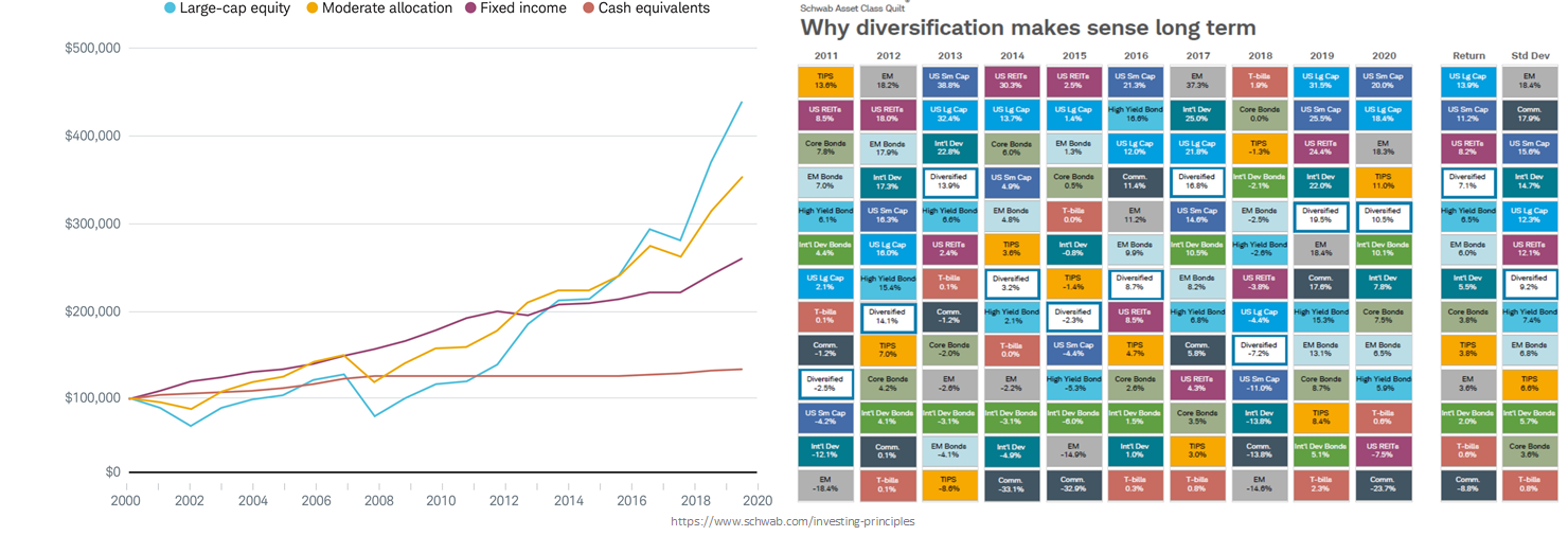 2000년 초에 $100,000을 미국 주식에 투자했다면 20년간 변동성이 많았지만 2020년 말까지 거의 $425,000로 성장했을 겁니다. 현금이나 채권에 투자했다면 안정적인 투자였지만 최종 수익은 주식에 비해 줄어들었을 겁니다. 따라서 적절한 포트폴리오를 구성하는 것이 장기적으로 변동성을 낮추고 주식의 성장을 취할 수 있는 좋은 방법입니다.