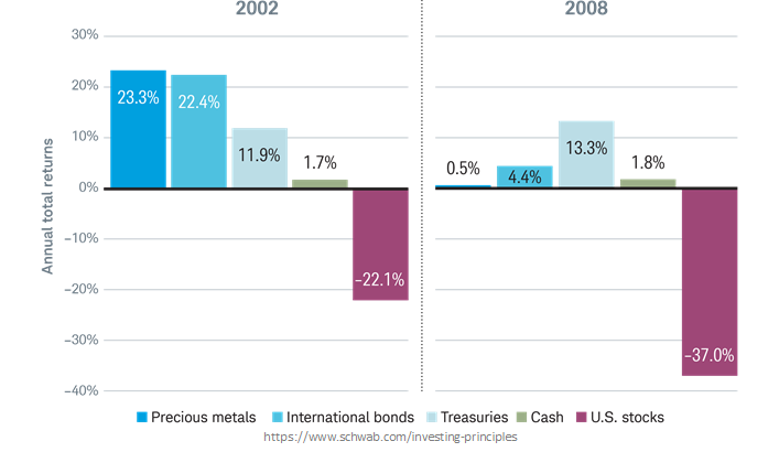 최근 두 번의 시장 침체기 동안 방어 자산은 긍정적인 수익률을 기록하여 미국 주식을 크게 능가했습니다.