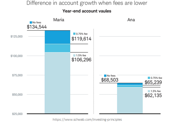 10년 동안 매년 S&P 500 지수를 추적하는 가상 포트폴리오에 3,000달러를 투자하고 다음 10년 동안 아무것도 투자하지 않는다고 가정하겠습니다. 20년 동안 수수료를 3/4 포인트 낮추면 마리아는 약 $13,000, 애나는 약 $3,000를 절약할 수 있습니다.