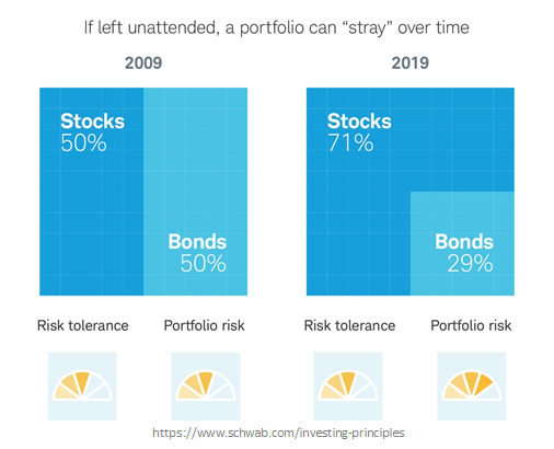 예를 들어, 2009년 포트폴리오가 주식과 채권에 50/50으로 시작했으며 결코 재조정되지 않았다면, 향후 10년 동안 포트폴리오는 주식 71%와 채권 29%로 변하게 되고 2020년 초 COVID-19 위기가 닥쳤을 때 정기적으로 재조정한 경우보다 더 큰 손실을 입게 되었습니다.