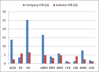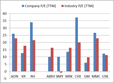 KR, ABBV, MRK, GM은 동종 산업 평균보다 P/E 비율이 낮음