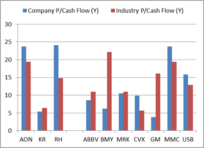 KR, ABBV, BMY, MRK, GM은 동종 업계 평균보다 P/Cash Flow가 낮음