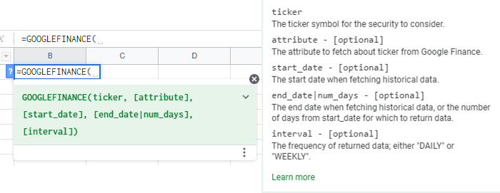 =GOOGLEFINANCE( ticker, [attribute], [start_date], [end_date|num_days], [interval])