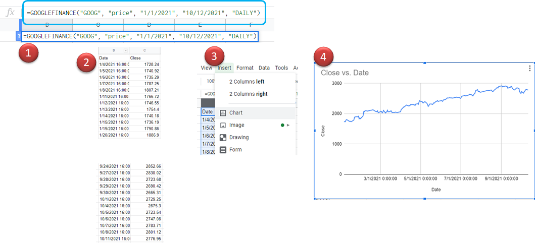 =GOOGLEFINANCE("GOOG", "price", "1/1/2021", "10/12/2021", "DAILY")