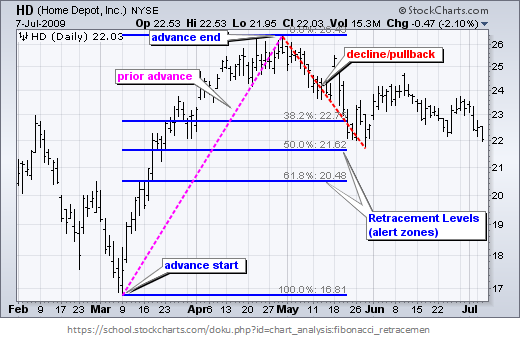 아래 예는 하락이 시작되었을 때 피보나치 되돌림 수준을 통해 조정을 확인할 수 있습니다. 주가 조정은 상승의 약 50%를 되돌리고 있으며, 50% 비율은 지지를 해주고 있습니다.