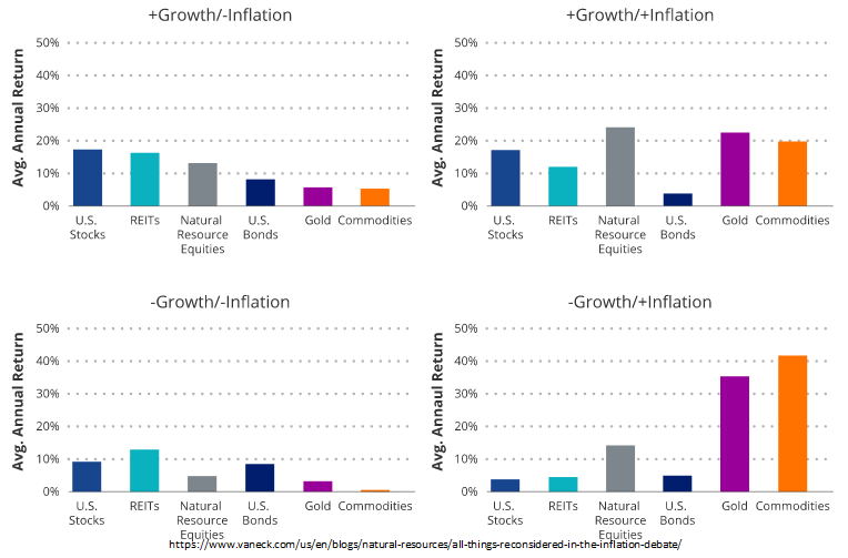 경제 성장 -, 인플레이션 +: 금과 원자재의 수익률이 좋음