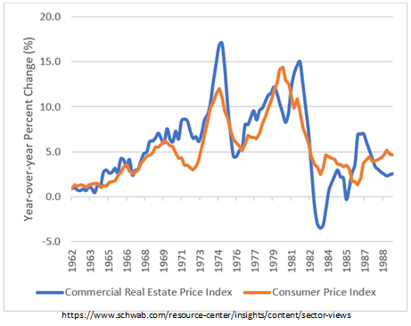 아래 그림은 상업용 부동산은 일반적으로 인플레이션과 함께 상승하는 것을 보여줍니다.