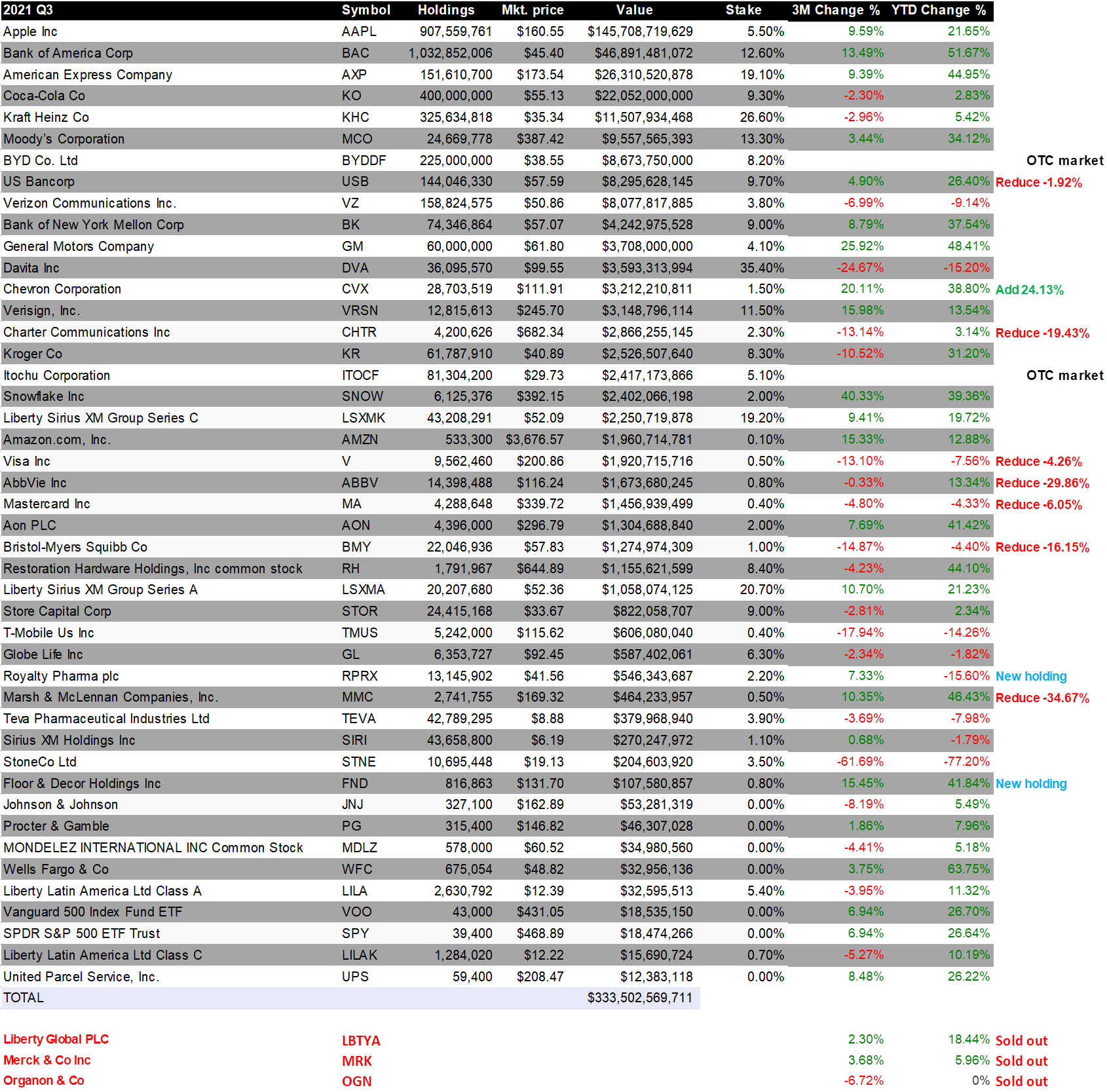 2021년 11월 15일 Berkshire Hathaway의 13F 서류가 공개되었습니다. 보고된 서류는 2021년 9월 30일 기준으로 한 데이터로 Berkshire Hathaway의 포트폴리오입니다.