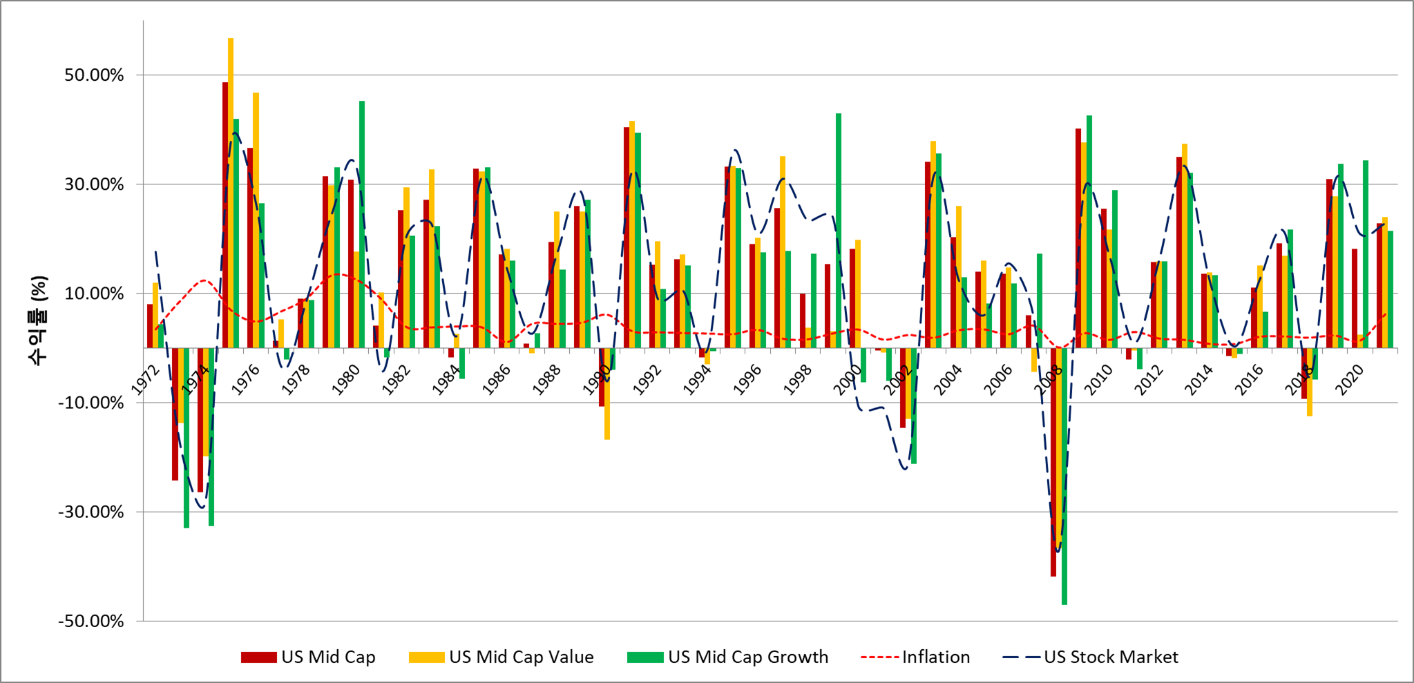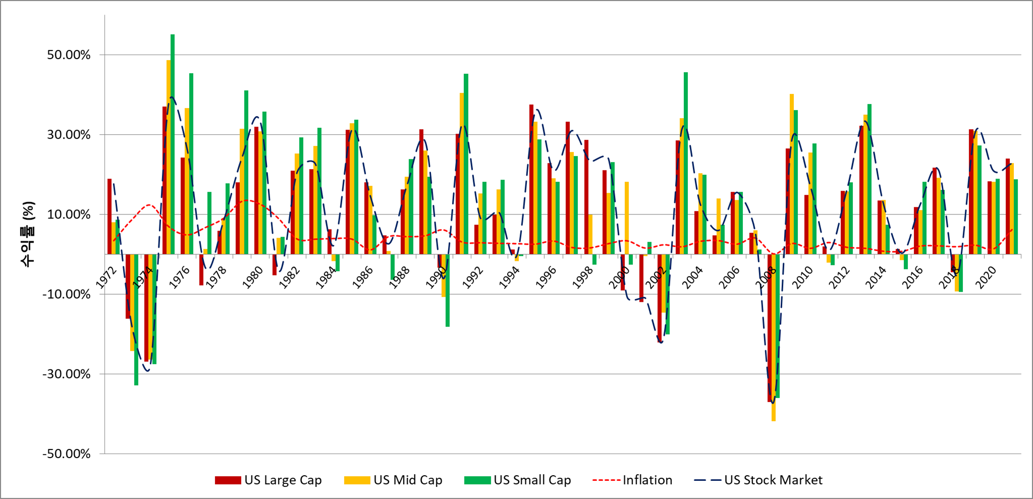 주식은 다른 자산에 비해 전반적으로 좋은 수익률을 보여주고 있으며, 주식에서는 Mid cap과 Small cap이 large cap보다 좋은 수익률을 보여주고 있습니다.
