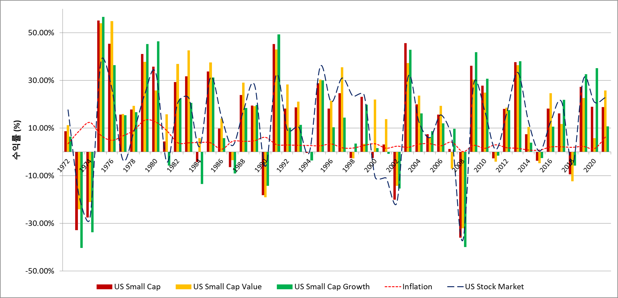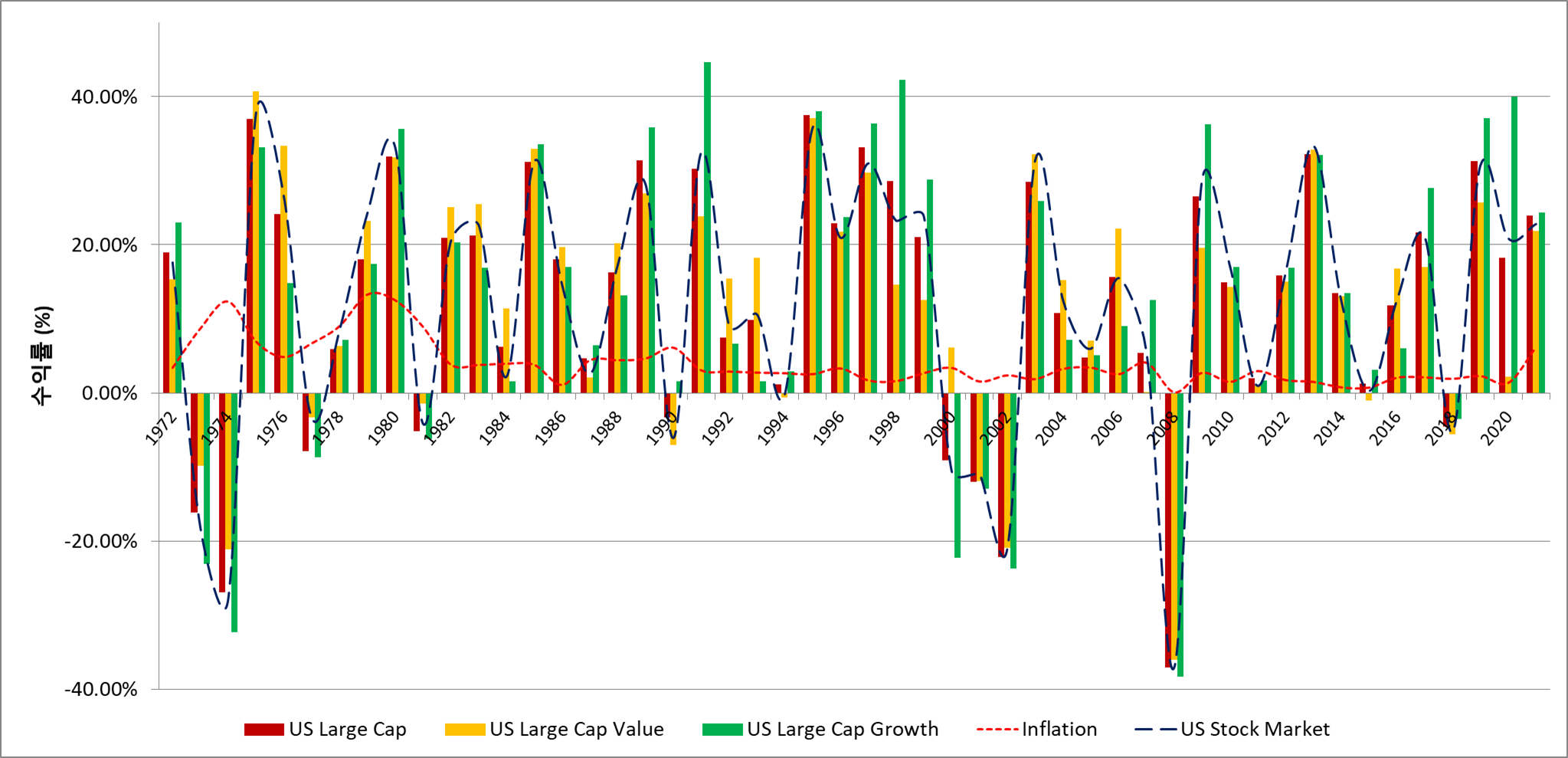 미국 시장 Large cap, Mid cap, Small cap별 가치주와 성장주를 주식 시장 전체 수익률과 인플레이션에 따라 비교한 그래프입니다.