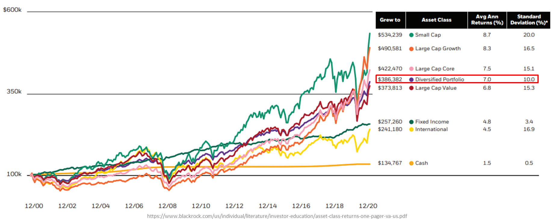 다음은 100,000달러를 2001-2020까지 투자했을 때 수익률을 보여주는 그래프로 포트폴리오의 다양성이 중요하다는 것을 보여주는 그래프입니다.