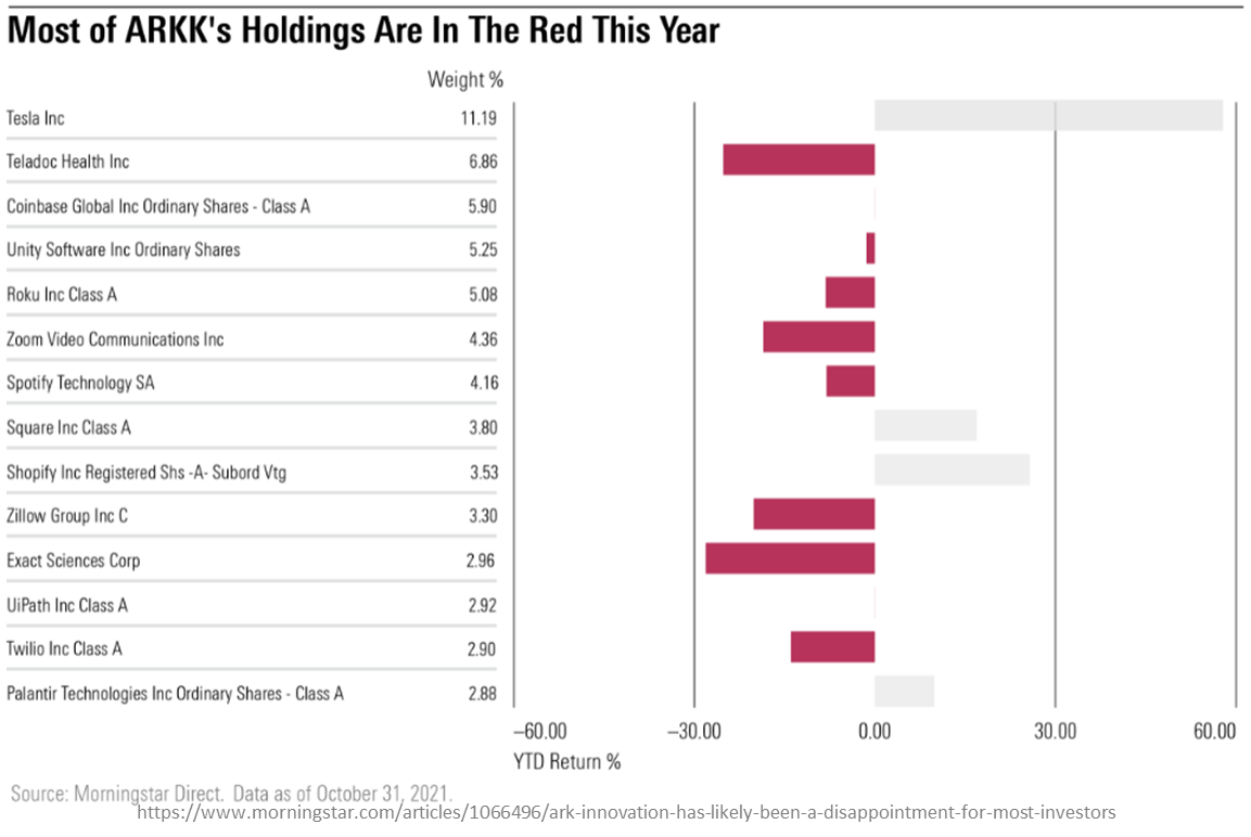 다음은 2021년 10월 31일 기준 ARKK에 포함된 종목들의 YTD 수익률입니다. 몇 종목을 제외하고 상당한 마이너스를 보여주고 있습니다.