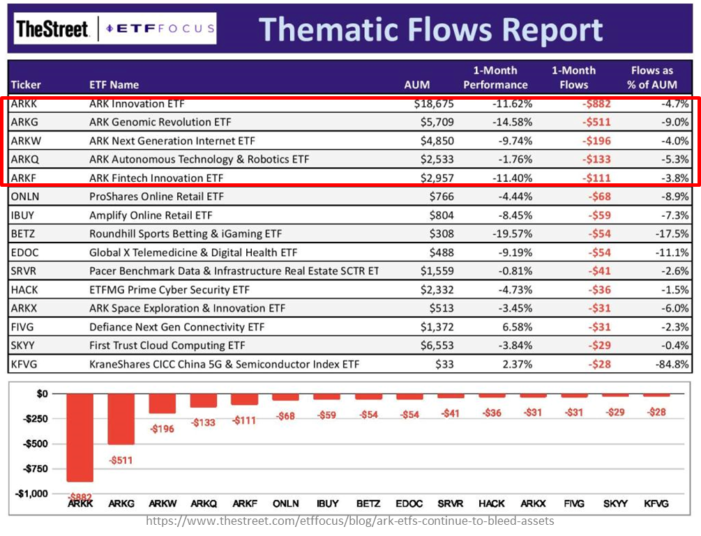 다음은 테마형 ETF의 지난 한 달간 자금 유출을 정리한 표로 Ark Investment의 5개 ETF가 1위부터 5위까지 차지하고 있습니다.