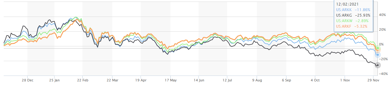 한 달 만에 총자산의 4~9%를 잃었습니다. 5개의 모든 ARK ETF의 총자산은 2021년 고점에서 35%에서 55% 사이 감소했습니다.