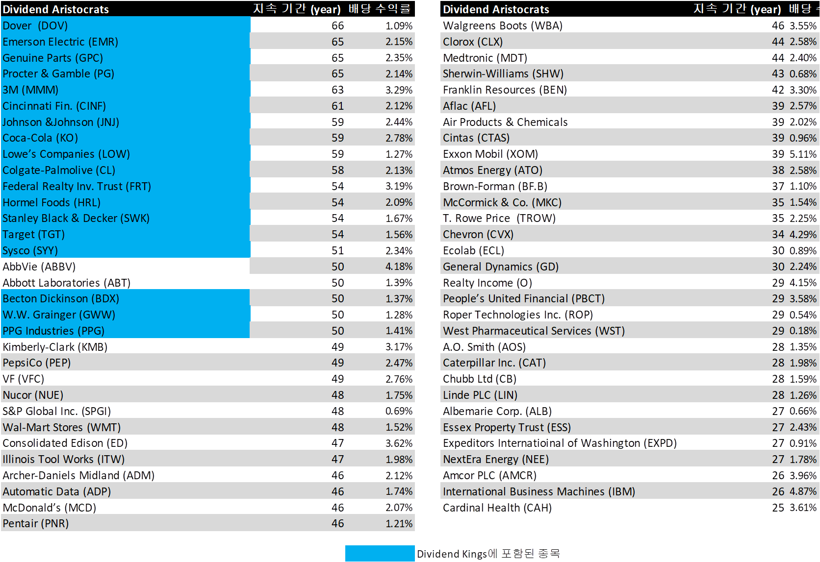 배당 귀족 (Dividend Aristocrat)은 최소 25년 연속 배당금을 늘렸습니다.
