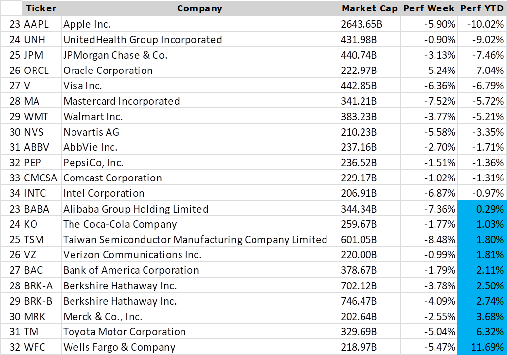 심지어 YTD 실적이 5% 이상인 종목도 있습니다. Toyota가 6.32%, Wells Fargork 11.69% 상승하였습니다.
