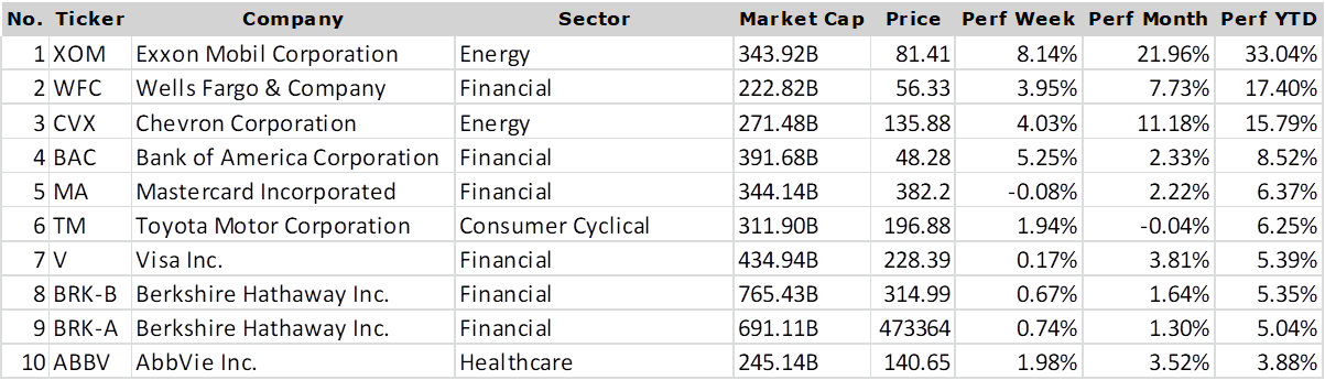 YTD 수익률 10위 안의 종목들을 보면 에너지 섹터의 두 개 종목이 (XOM, CVX)이 포함되어 있으며