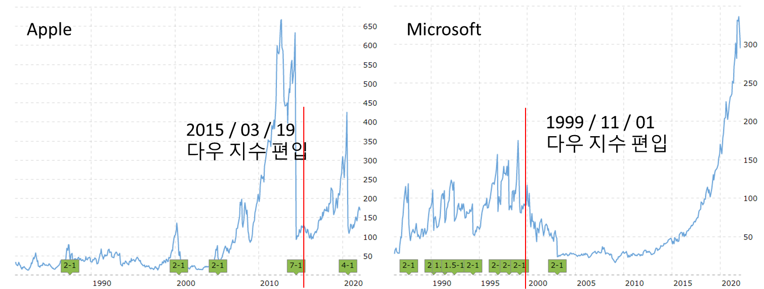 빅 테크 중 다우 지수에 포함되어 있는 Apple과 Microsoft는 지속적인 주식 분할을 통해