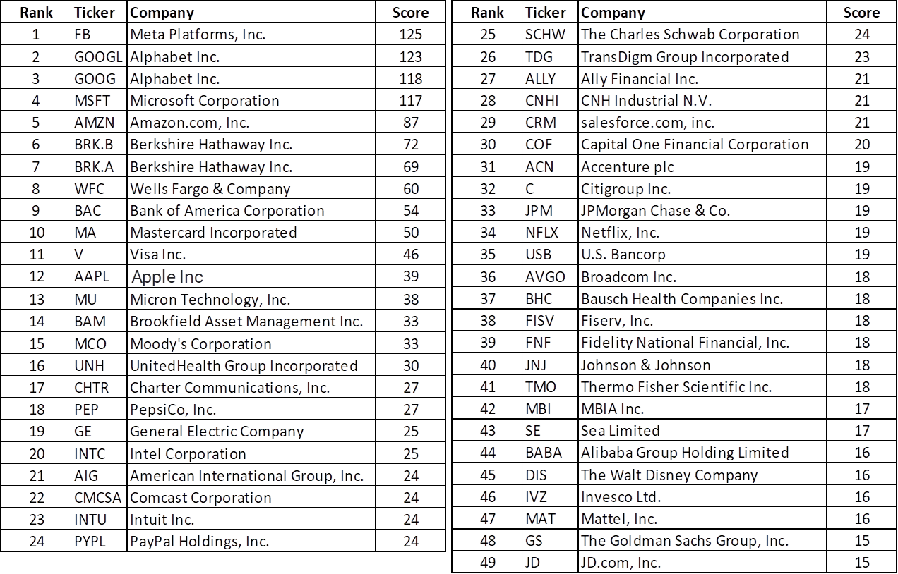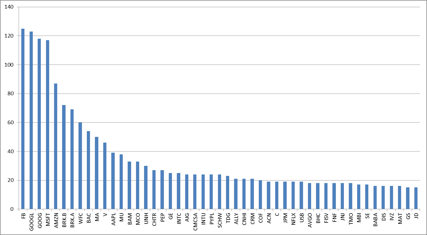 상위 종목들을 보면 빅 테크 종목(FB, GOOGL, MSFT, AMZN)과 금융 관련 종목(BRK.B, WFC, BAC, MA, V) 들이 포함되어 있습니다.