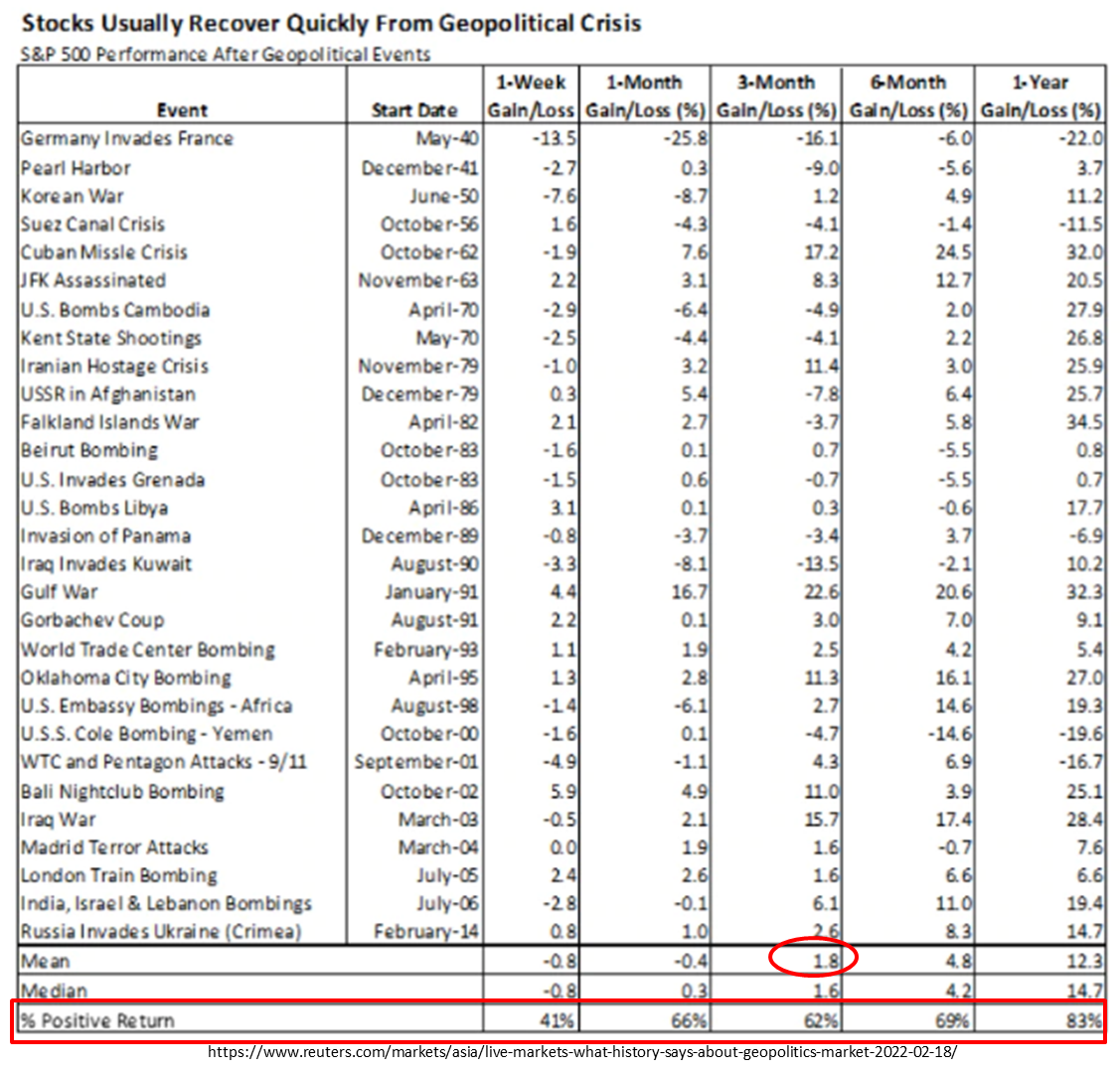 평균적으로 지정학적 위기 발생 이후 3개월 만에 주가가 상승했으며 (평균 1.8% 상승)