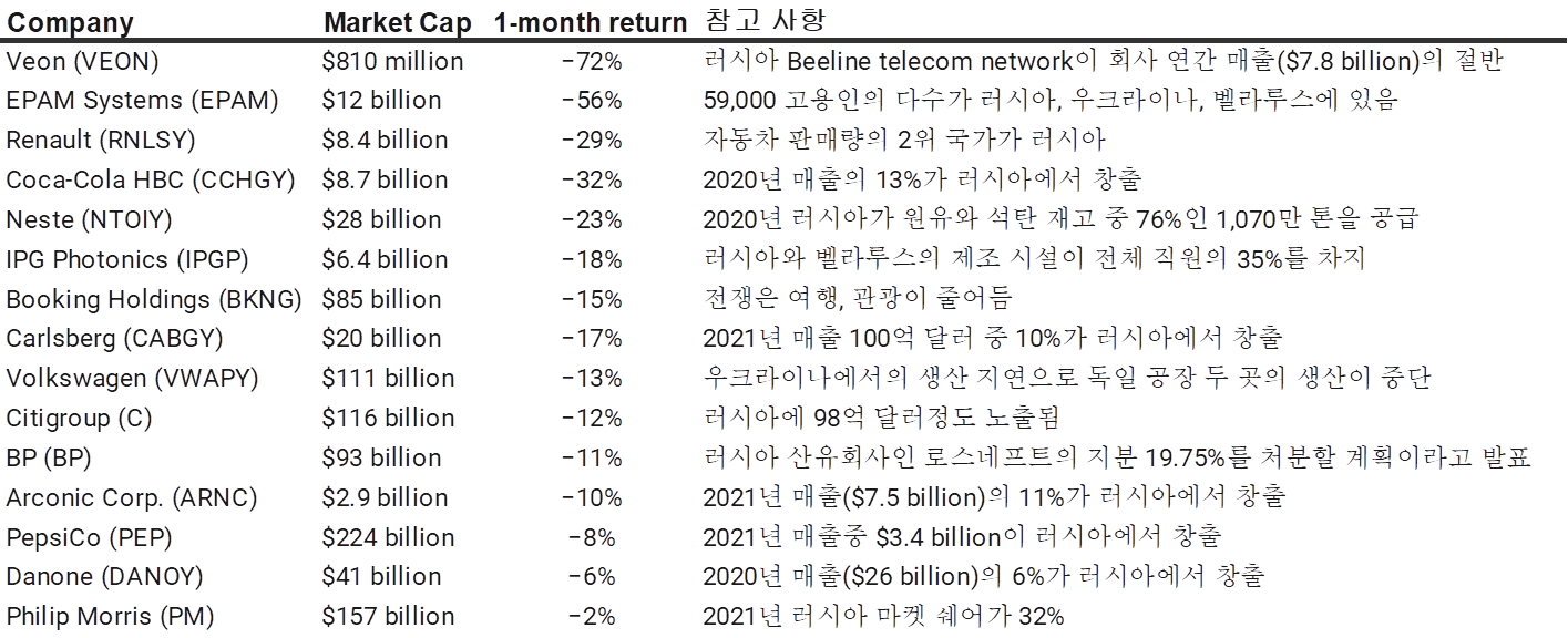 러시아의 우크라이나 침공에 영향을 받은 개별 종목들